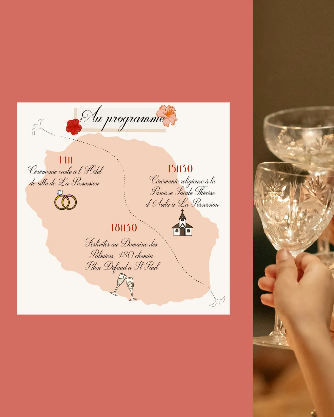 Leur souhait : un visuel sur mesure, coloré et élégant, qui intègre des éléments tropicaux et évoque l’île de La Réunion.