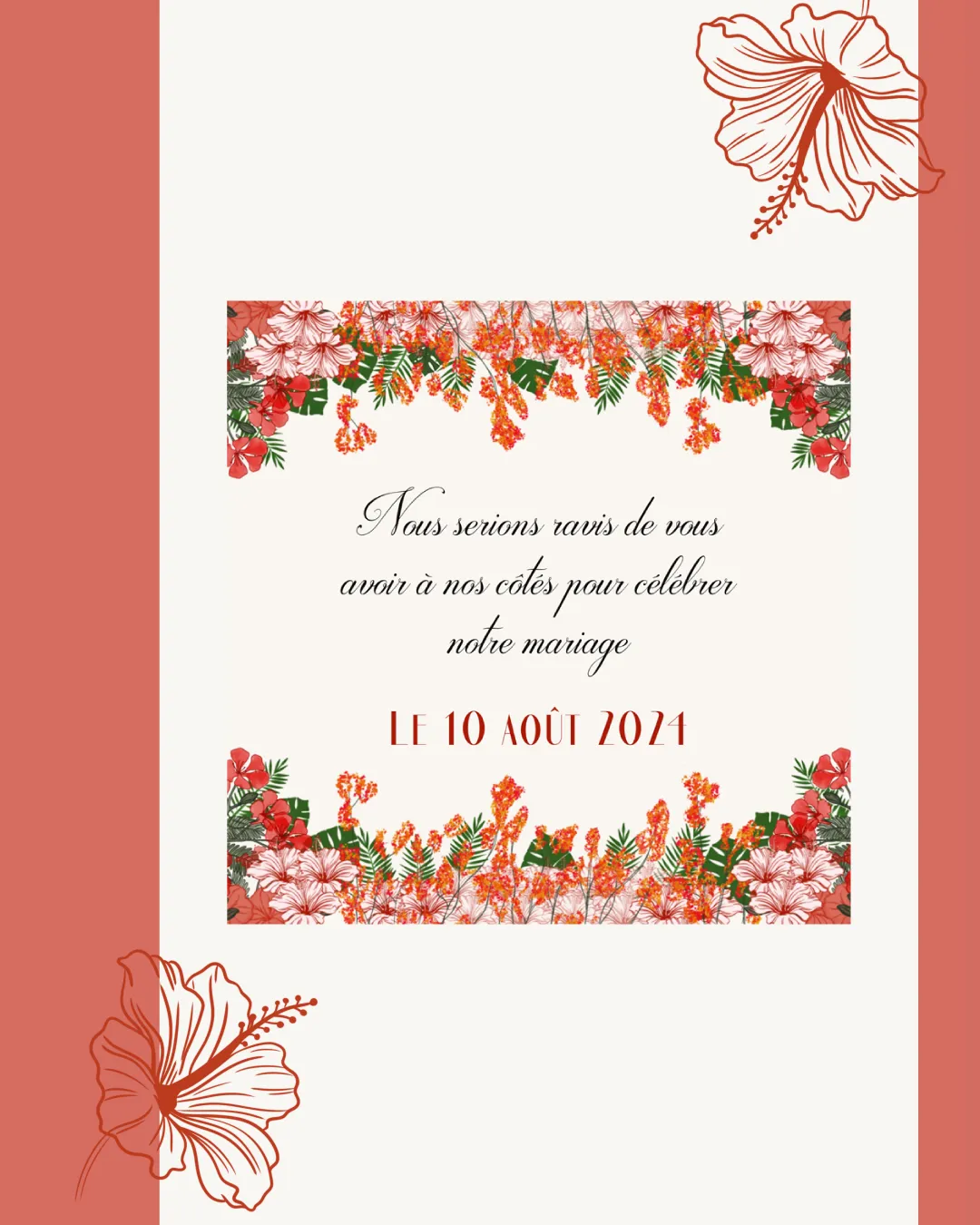 Le faire-part mêle une composition florale illustrée avec des teintes naturelles et vibrantes, inspirées des paysages réunionnais.